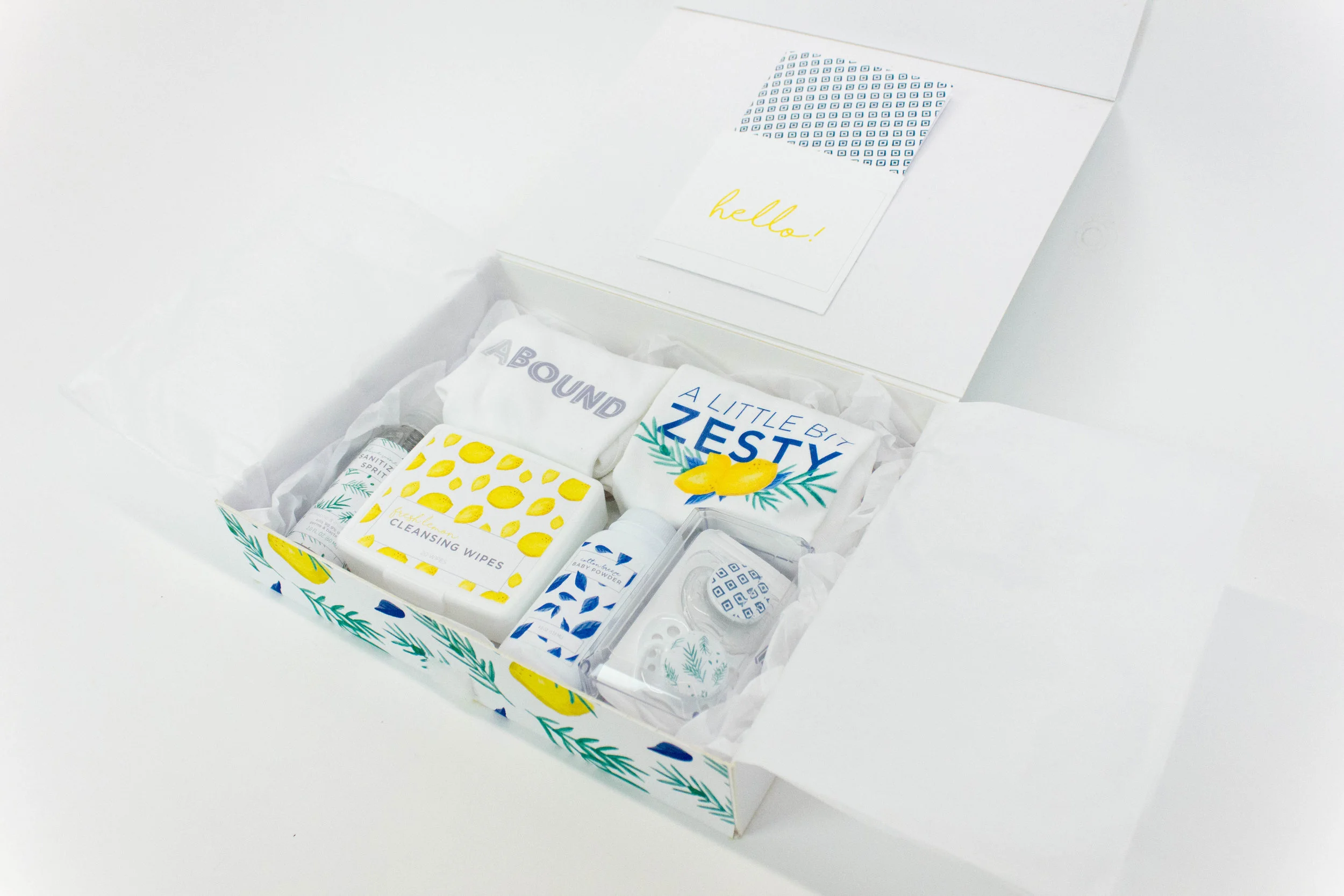 The pacifiers are included as comfort items for the baby, especially for when they are being changed. The designed onesie is handy to have around as a change of clothes for the little one and carries a fun little saying that not only refers to the Mediterranean theme, but also to the “zest” that a baby brings to life.